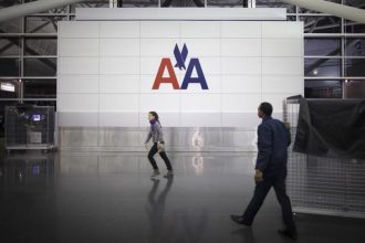 2/2 © Reuters. A American Airlines plane taxis in front of the skyline at Logan…