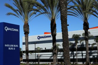 © Reuters. FILE PHOTO: A smartphone with a displayed Broadcom logo is placed on a…