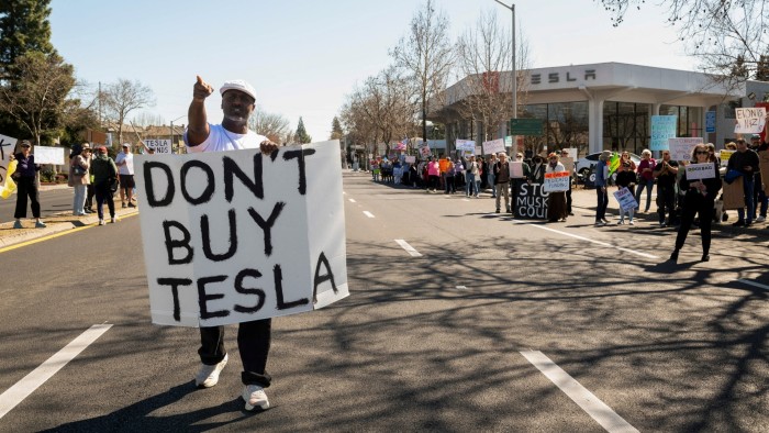 Tesla car showrooms across the US were recently targeted by protesters railing against Musk’s swingeing cost-cuts in the federal government and his support for Germany’s far-right.
