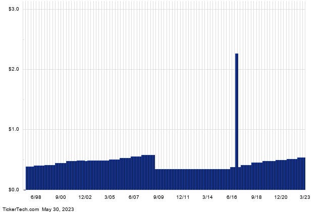 The current annualized dividend paid by Kilroy Realty is $2.16/share, currently paid in quarterly installments, and its most recent dividend has an upcoming ex-date of 06/29/2023. Below is a long-term dividend history chart for KRC, which the report stressed as being of key importance. Indeed, studying a company’s past dividend history can be of good help in judging whether the most recent dividend is likely to continue.