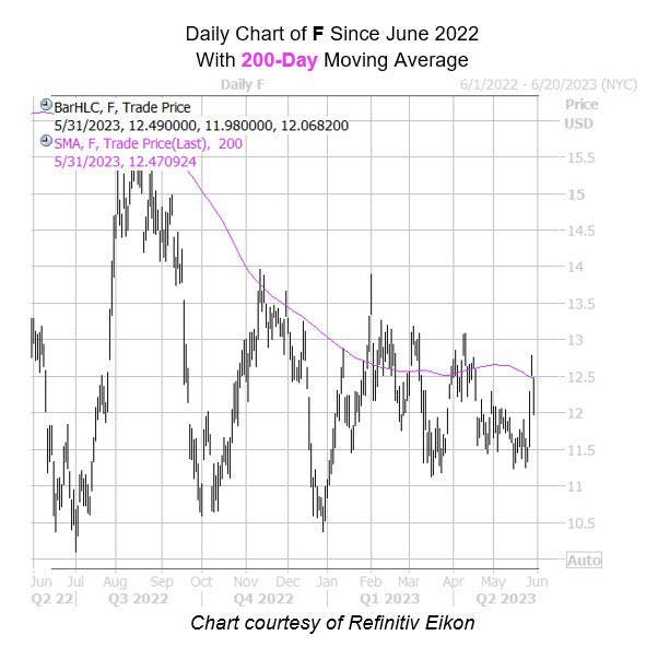 Calls have been a long-term favorite, too. At the International Securities Exchange (ISEE), Cboe Options Exchange (CBOE), and NASDAQ OMX PHLX (PHLX), F sports a 50-day call/put volume ratio of 2.20 that sits in the 100th percentile of its annual range. Should all this bullish sentiment begin to unwind, it could add pressure to the shares Ford Motor.